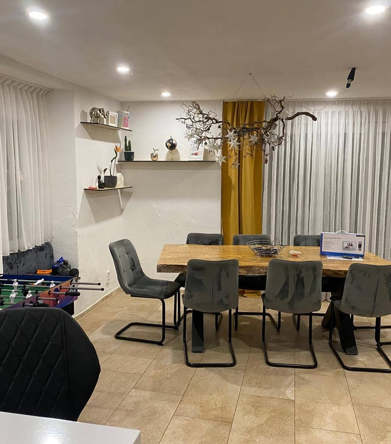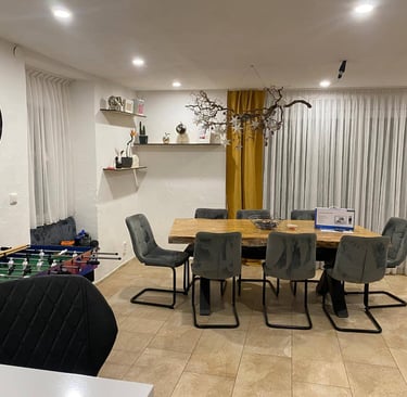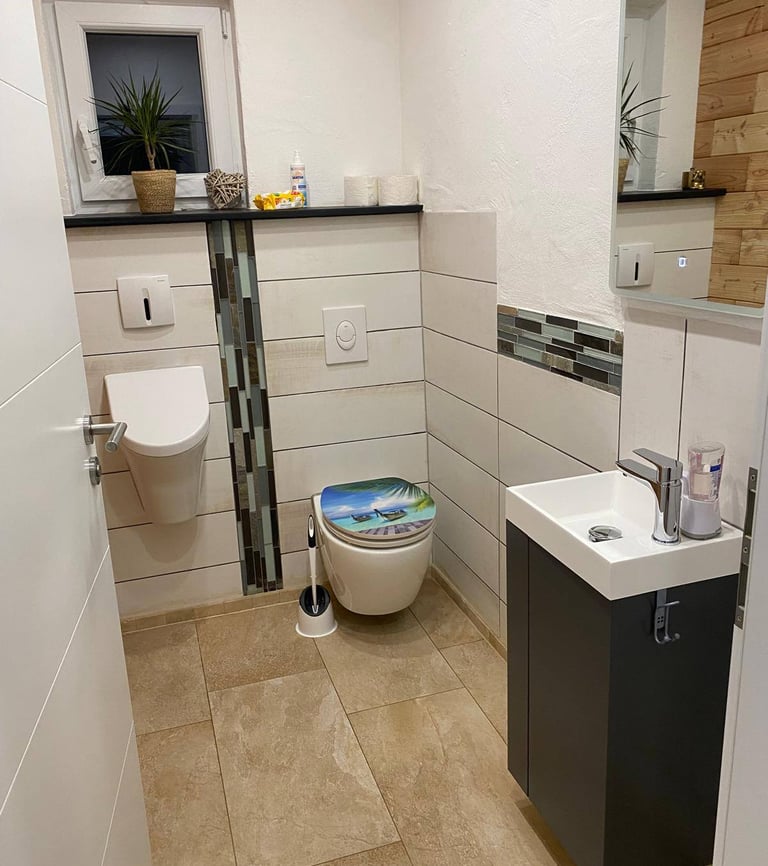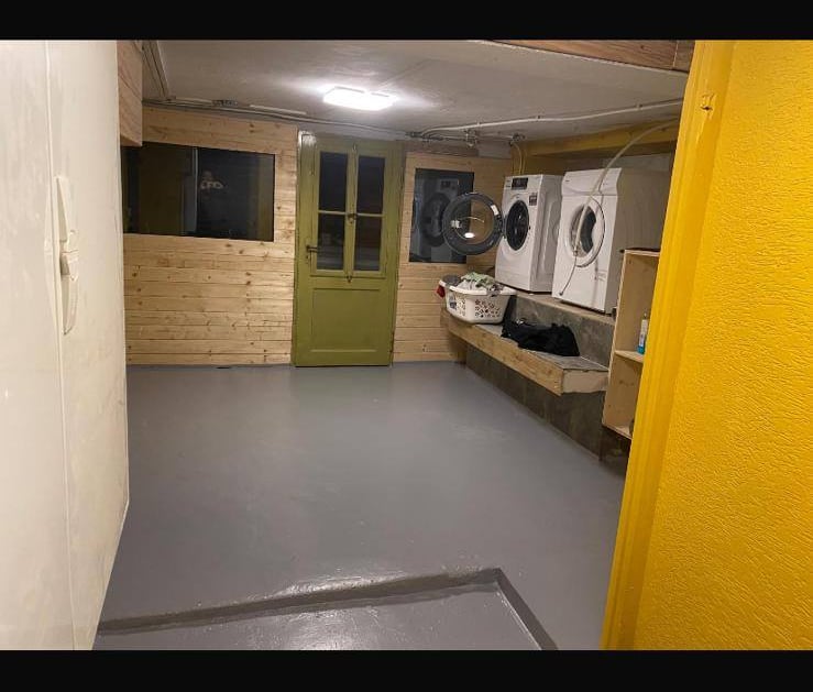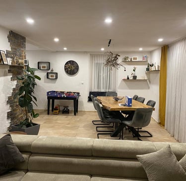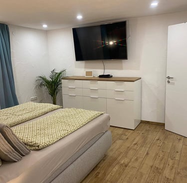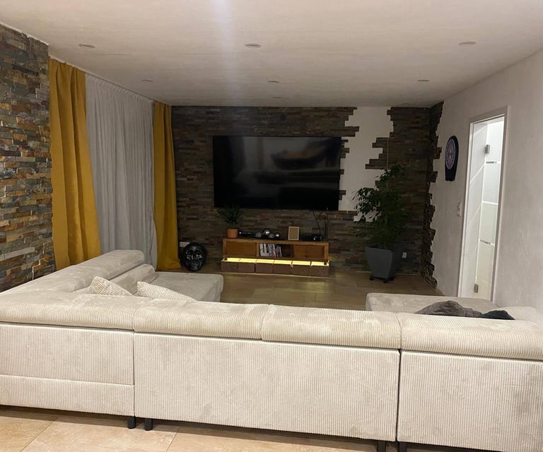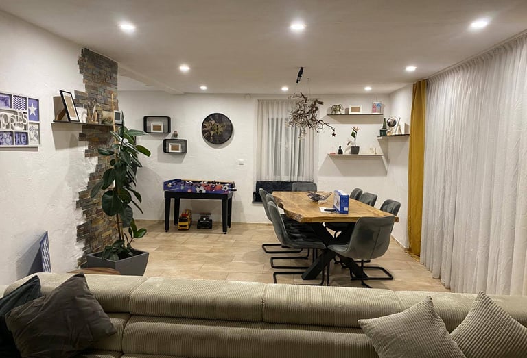 Im Keller findest du einen Heizungsraum mit moderner Pelletheizung, einen Waschraum sowie ein stilvolles Badezimmer mit Whirlpool-Badewanne, Fernseher und Kaminfeuer. Außerdem bietet das Haus eine Garage und ein separates Büro, das sich perfekt für Home-Office oder Hobby eignet.