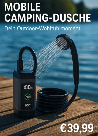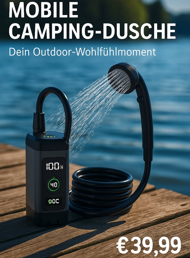 Die mobile Dusche mit 6000 mAh Akku, digitaler Anzeige und High/Low-Modus – perfekt für Camping, Garten oder Outdoor-Abenteuer.