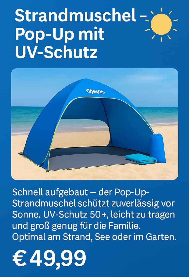 Schnell aufgebaut – der Pop-Up-Strandmuschel schützt zuverlässig vor Sonne. UV-Schutz 50+, leicht zu tragen und groß genug für die Familie. Optimal am Strand, See oder im Garten.